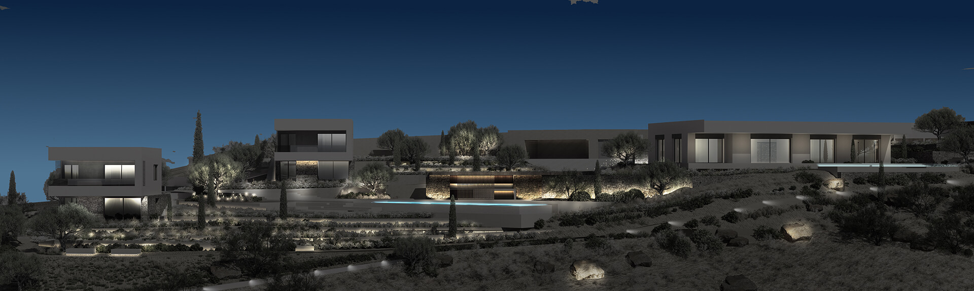 The lighting study for the landscape of the residential complex in Kos Island focuses on creating a serene and harmonious environment through the use of low lighting levels, effectively minimizing light pollution and controlling light trespass into surrounding areas.