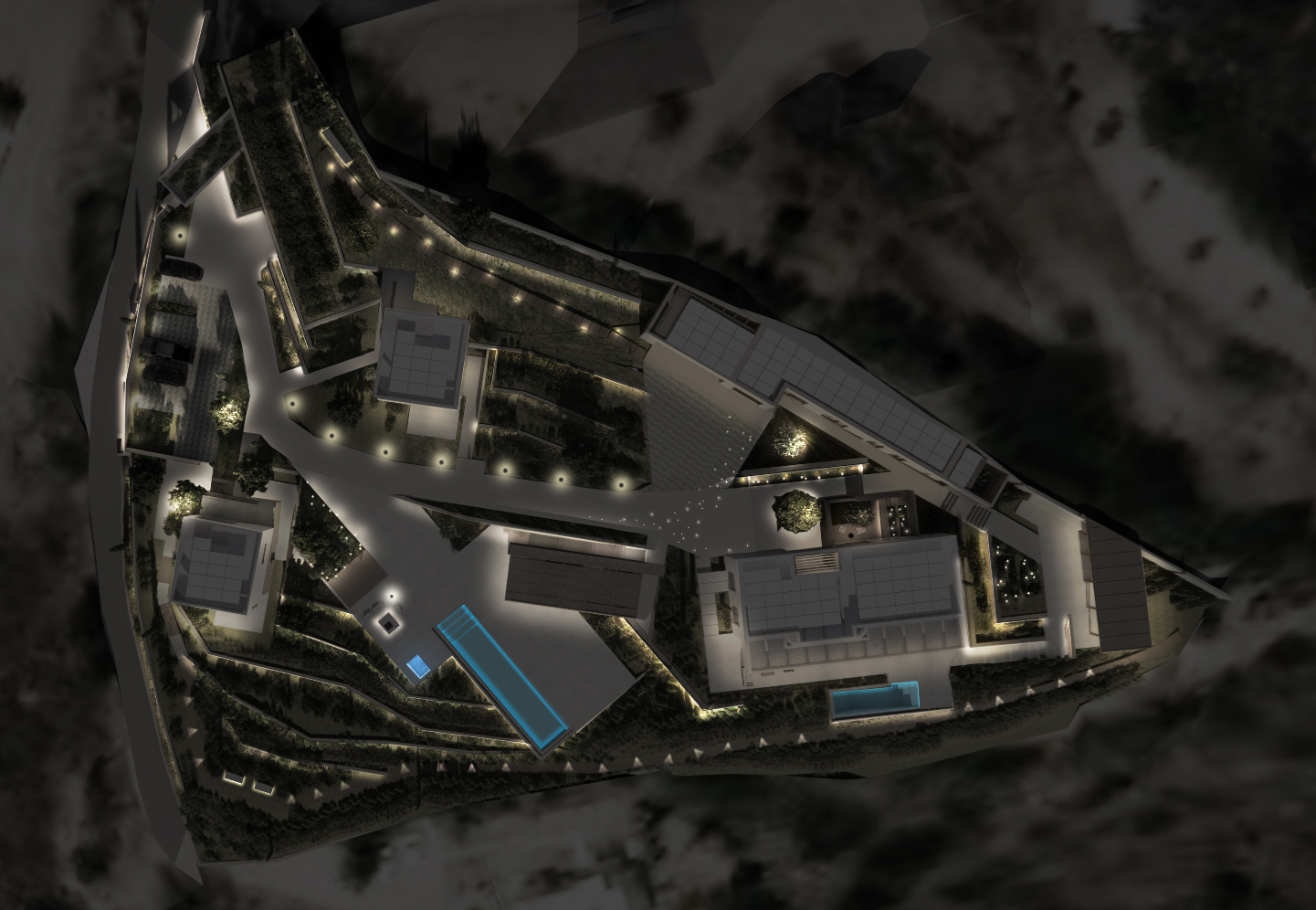 The subtle illumination of the surrounding plantations highlights native flora without overwhelming the natural landscape and considers the well-being of local wildlife by avoiding excessive brightness. Furthermore, the system includes controlled and limited lighting duration during nighttime hours, promoting energy efficiency and preserving the tranquil ambiance of the complex while prioritizing the ecological balance of the area.